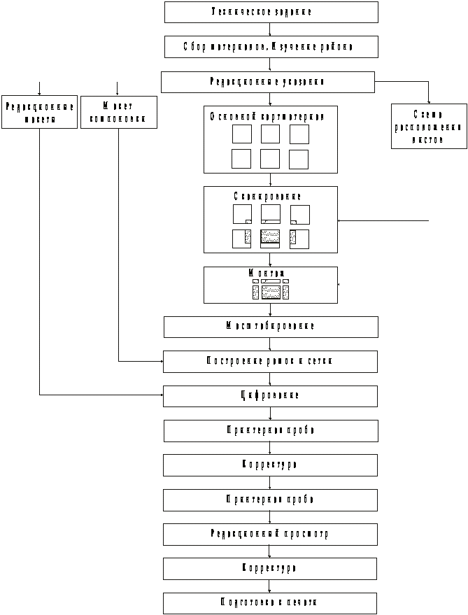 В процессе работы предстоит сделать обоснованный выбор исходного картографического материала, определить степень его соответствия назначению и содержанию создаваемой карты и установить рациональную технологию составления (обновления) карты. С учетом выбранной технологии составляются редакционные указания, таблицы условных знаков, необходимые редакционные схемы и макеты.