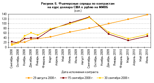 В последний день месяца котировки срочных контрактов на доллар США на ММВБ с исполнением 15.10.2008 составляли 25,51 руб. за доллар, с исполнением 15.12.2008 — 25,89 руб. за доллар, с исполнением 15.02.2009 — 25,92 руб. за доллар. Это свидетельствует о том, что в сентябре участники срочного биржевого валютного рынка ожидали дальнейшего роста номинального курса доллара США к рублю19.