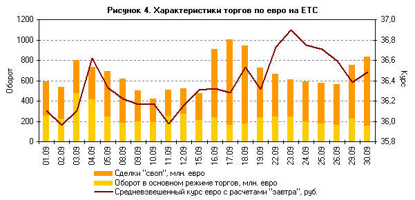 Совокупный биржевой оборот по операциям рубль евро увеличился на 28,1% — до 14,5 млрд. евро. Доля операций "своп" в структуре биржевого оборота по евро существенно возросла — с 56% в августе до 65% в сентябре.