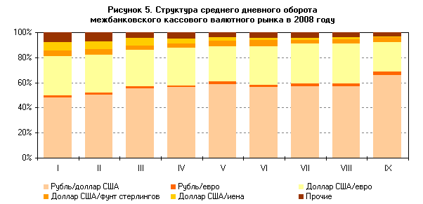 При значительном увеличении биржевого оборота внутреннего валютного рынка средний дневной оборот межбанковских кассовых конверсионных операций по всем валютным парам в пересчете на доллары США уменьшился на 3,4% (до 105,3 млрд. долл. США), в основном за счет сокращения оборота по операциям доллар США/евро на 29,0% (до 24,6 млрд. долл. США). Средние дневные обороты по прочим основным валютным парам возросли: по операциям рубль/доллар США — на 12,0% (до 69,7 млрд. долл. США), по операциям рубль/евро — на 16,6% (до 2,8 млрд. в долларовом эквиваленте), по операциям доллар США/фунт стерлингов — на 20,4% (до 4,1 млрд. долл. США), что привело к некоторым сдвигам в структуре оборота по валютным парам.