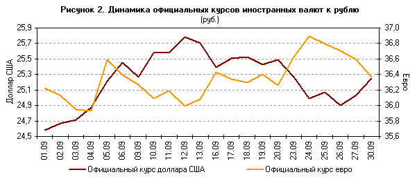 Волатильность котировок евро и доллара США к рублю оставалась высокой. По итогам сентября официальный курс доллара США к рублю повысился на 3,2% — до 25,3718 руб. за доллар США на 1.10.2008, официальный курс евро к рублю повысился на 0,8% и составил на ту же дату 36,4999 руб. за евро.