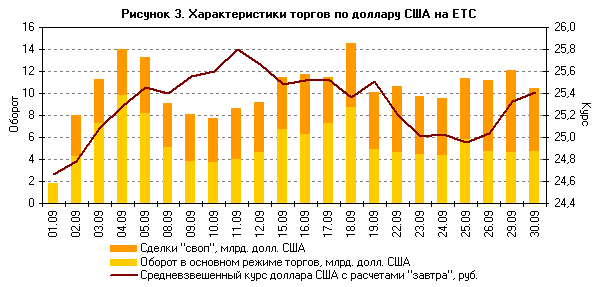 В сентябре отмечалось повышение активности биржевой торговли, в том числе за счет реализации иностранной валюты Банком России. Суммарный оборот торгов по операциям рубль/доллар США на ЕТС в сентябре по сравнению с августом возрос на 19,1% (до 225,4 млрд. долл. США). Доля операций "своп" в структуре биржевого оборота по доллару США за рассматриваемый период возросла с 44 до 47%.