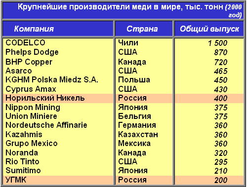 Как уже было отмечено выше, крупнейшие мировые производители меди сосредоточены, как правило, в районах залегания медных руд. Кроме того, следуя последним тенденциям на рынках, все крупнейшие производители меди в течение конца 90-ых начале 2000 года проводили активные процессы укрупнения и консолидации. Не обошла стороной данная тенденция и представителей России. Так, после ряда объединений на медном рынке в стране сформировалось устойчивое равновесие, поддерживаемое двумя крупнейшими игроками – Уральской горно-металлургической компанией (УГМК), объединяющей в основном европейские предприятия по выпуску и добычи меди в России, и ГМК «Норильский никель», консолидировавшей в основном северные предприятия отрасли. Обе эти компании являются крупнейшими и занимают высокие позиции в мировой табели о рангах медных производителей.