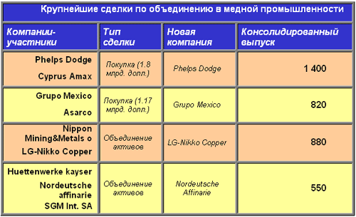 Наиболее крупными были две сделки между североамериканскими производителями. Первая из них – покупка американской компанией Phelps Dodge своего конкурента Cyprus Amax. Первоначально планировалось поглощение компанией Phelps Dodge своих более мелких конкурентов - Asarco и Cyprus Amax – с ориентировочной стоимостью в 2,75 млрд. долларов. Эта операция в случае успеха давала возможность PD обогнать по объему выпуска чилийскую компанию CODELCO и стать самым крупным производителем меди с годовым выпуском в 1,7 млн. т. меди в год. Однако консолидированной покупки осуществить не удалось. В самый последний момент в процесс переговоров вмешалась мексиканская горнодобывающая компания Grupo Mexico и предложив акционерам Asarco более выгодные условия, сумела победить PD. В результате PD присоединила к своим активам за сумму в 1,8 млрд. долл. только акции Cyprus Amax. После этих сделок как Phelps Dodge, так и Grupo Mexico значительно усилили свои позиции на мировом рынке, заняв второе и третье места среди крупнейших производителей меди.