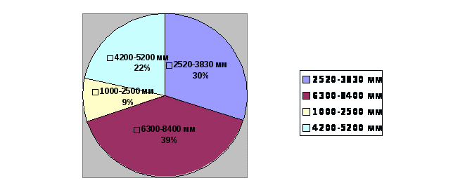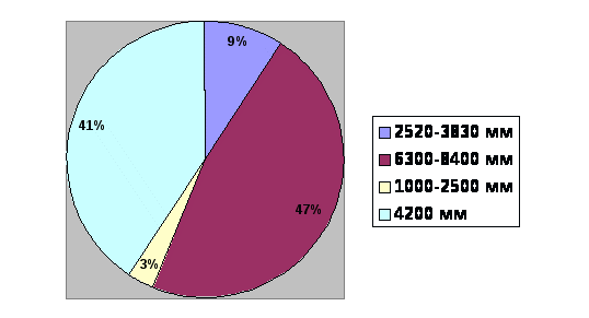 Рисунок 3. Распределение мощностей картоноделательных машин на предприятиях СНГ в зависимости от обрезной ширины, тыс. т: