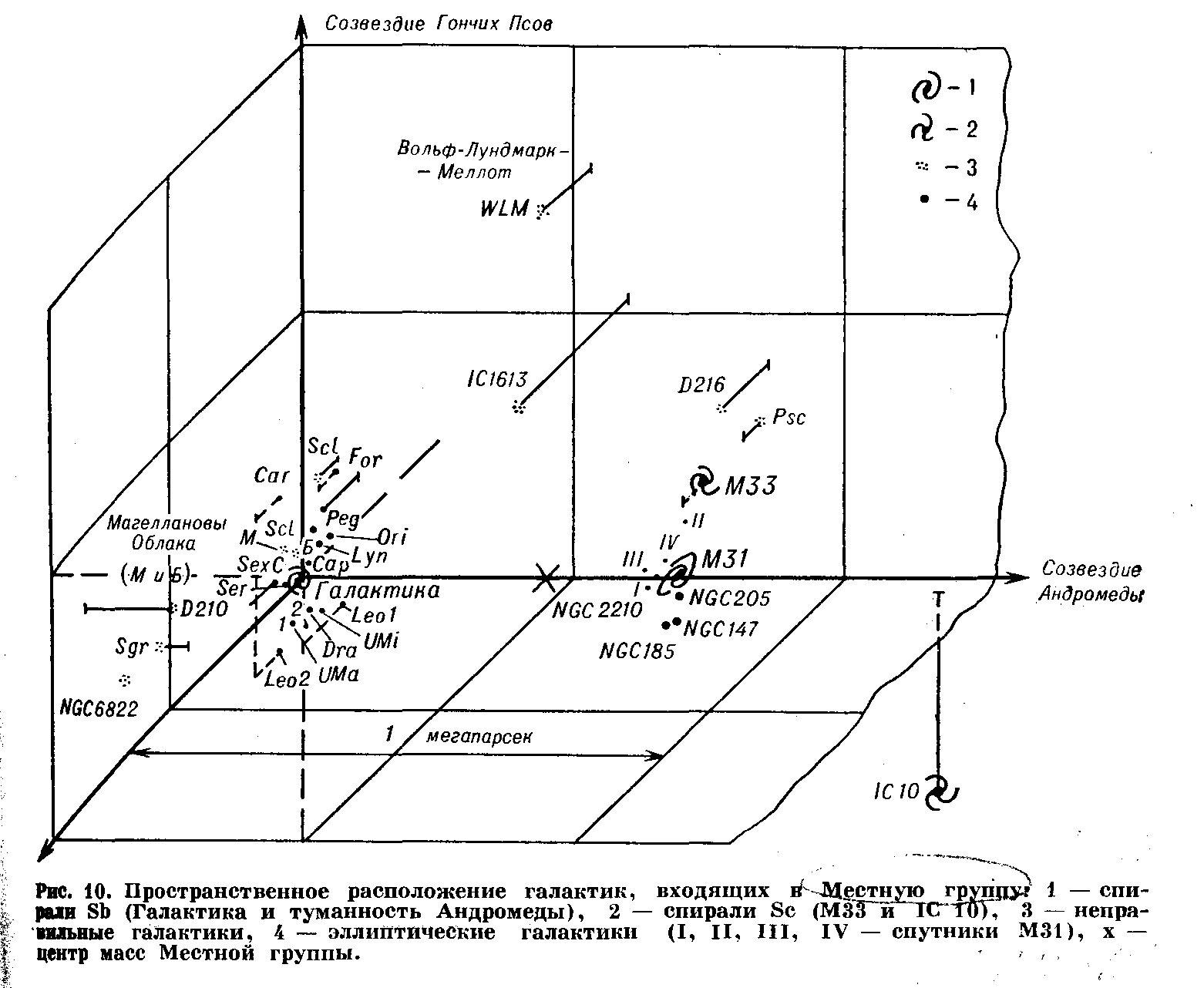 Соседние с местной группой галактик 10-13-й величины вращаются вокруг скопления в Деве. Общее число галактик нашего сверхскопления, исключая карликовые, - около 20 000. Его соседями являются сверхскопления во Льве (на расстоянии 140 Мпк) и в Геркулесе (190 Мпк). Всего выявлено пока около 50 сверхскоплений.