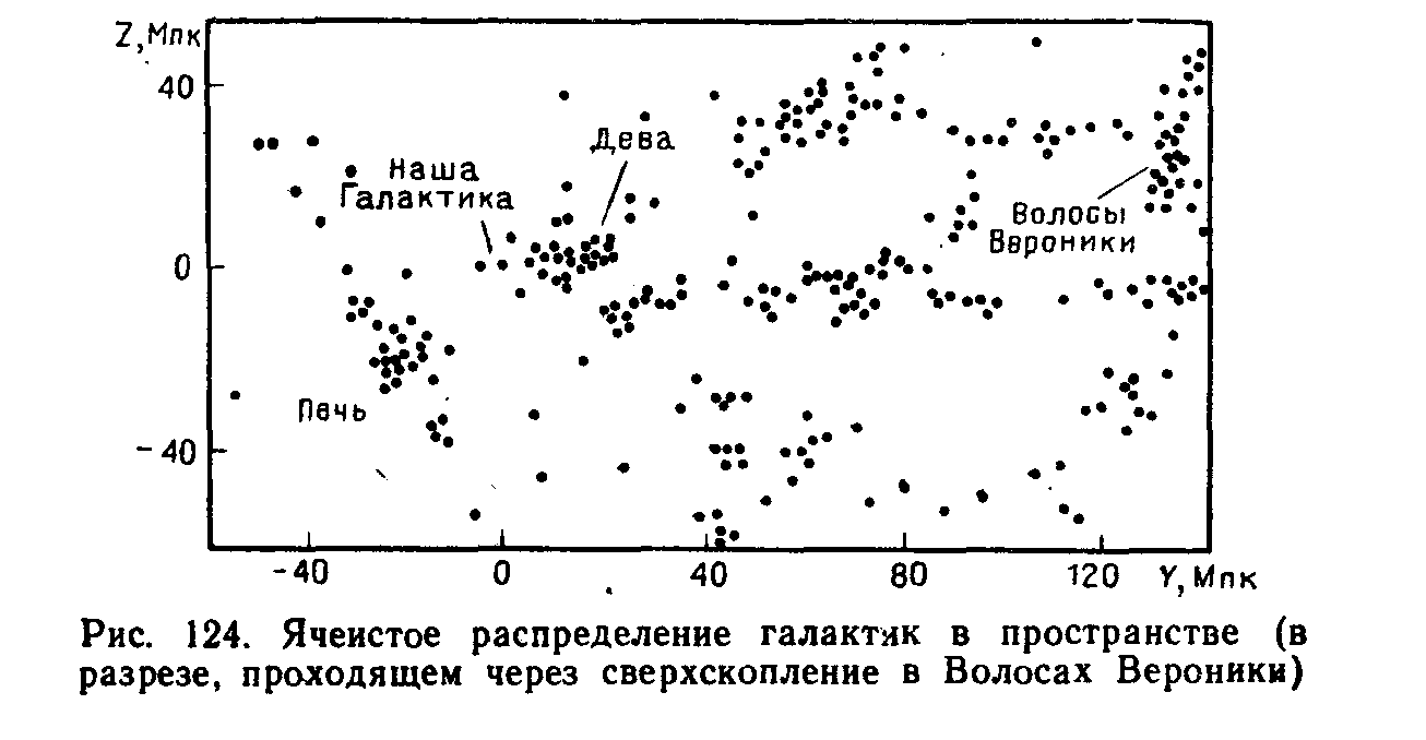 В конце XVIII в. Гершель В. построил первую модель Галактики. В ХХ в. Э. Хаббл начал работу по исследованию строения галактического мира. К 1943 г. он подсчитал количество галактик до 20-й звёздной величины на 1238 участках, которые равномерно распределил на небесной сфере. И нашёл, что на один квадратный градус в среднем приходится 131 галактика со звёздной величиной до 20m. Галактики образуют группы скопления, в которые входят от десятка до десятков тысяч членов. Сейчас известно около 4000 таких скоплений (Волосы Вероники, расстояние 400 световых лет от нас, диаметр почти 12, насчитывается около 40 тысяч галактик). Встречаются галактические скопления с общим количеством около 100 тысяч членов. Наша галактика имеет спутники: карликовые звёздные системы (Магеллановы Облака, Туманность Андромеды и ещё около 15 галактик-карликов), с которыми она образует Местную группу диаметром около 3 млн. световых лет. Обнаружено около 10 сверхскоплений – огромных систем размерами 50-150 Мпк, состоящих из нескольких скоплений, многих мелких групп и одиночных галактик. Все сверхскопления сильно сплюснуты или же сильно вытянуты и по форме напоминают цепочки. В направлении созвездия Персея на расстоянии от 24 до 80 Мпк галактик нет. «Чёрная область» обнаружена также в созвездиях Волосы Вероники, Геркулеса, Рыб. Вне указанных пределов наблюдается избыточная плотность галактик. Неоднородность в распределении галактик имеет локальный характер и в больших масштабах «в среднем» Вселенная однородна.