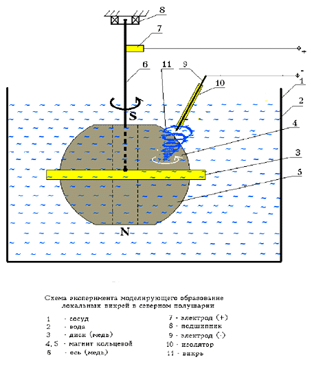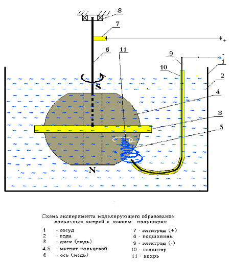 На рис.6 представлен этот эксперимент. На рис.6 изображены: 1 - сосуд, 2 - электропроводная жидкость, 3 – металлический диск, 4,5 – намагниченные полушария, 6 - ось, 7 – электрод, 8 – подшипник, 9 – электрод, 10 – изолятор, 11 – вихрь.