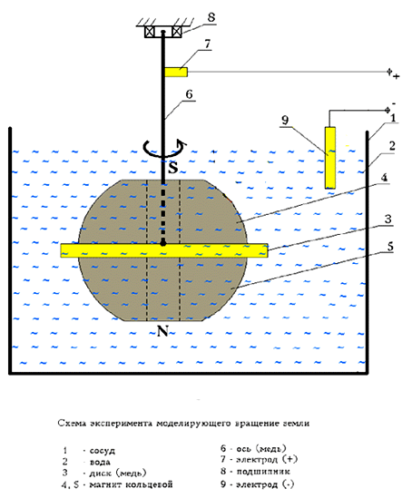 Исследования в области теории физического вакуума [2] позволили установить физические явления, которые на наш взгляд могут приблизить ответы на перечисленные выше вопросы. Речь, в частности, идет о физических эффектах, в которых при протекании электрического тока через электропроводную среду, помещенную в магнитное поле, в зонах расположения электродов возникают градиенты температуры среды, а также вихревые движения среды, обусловленные появлением момента силы в направлении перпендикулярном вектору магнитной индукции [2]. Как отмечено в [2], направление вихревого движения среды M задается векторным произведением M=BxE, а направление вектора теплового потока Q задается двойным векторным произведением: Q=[BxE]xB. Этот интегральный электромагнитогидродинамический и термический эффект, наблюдаемый в лабораторных условиях, может быть распространен на большое количество природных явлений. Ниже будут описаны некоторые лабораторные эксперименты, которые демонстрируют названные физические эффекты. Они, на наш взгляд, позволяют понять и раскрыть механизм вращения Земли. Поведение электропроводной жидкости в магнитном поле – это проявление физических эффектов, которые имеют большую аналогию с вращением Земли, а также с некоторыми другими явлениями в недрах Земли и на ее поверхности. Приводим описание эксперимента.