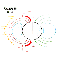 Солнечный ветер проникает в околоземное пространство через каспы, в зонах полюсов (показано жирными стрелками). В полярных зонах преобладают протоны. Распределение электрических зарядов в приполярных и в приэкваториальных областях Земли приводит к тому, что в космосе у Земли есть огромной мощности батарея. Ее "плюс" находится в зонах северного и южного полюсов, а "минус" в зоне экватора. На рис.4 мы видим полную аналогию с проведенным экспериментом, показанным на рис.2. В нашем эксперименте "плюс" подключен в точке прохождения условной оси вращающейся жидкости. Для электрического тока от космической батареи цепью является атмосфера Земли и сама Земля от полюсов к экватору. В таком же направлении протекает ток в жидкости в условиях нашего экспермента (рис.2). Как и в эксперименте (рис.2) наблюдается понижение температуры в зоне оси вращения электропроводной жидкости, так и в зоне земных полюсов наблюдаются низкие температуры. Находит объяснение противоречие: почему тепловой поток, идущий от центра Земли к ее поверхности, не в силах справиться с вечной мерзлотой? Причина этого состоит в том, что большой вклад в образование зон холода на Земле вносит температурный эффект, описанный в [2] и продемонстрированный на рис 2.
