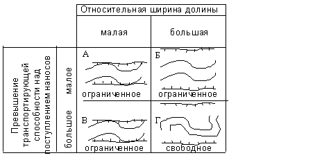 Обычно меандрирование разделяется на ограниченное и свободное; на рисунке 1 показано, что это разделение происходит по величине относительной транспортирующей способности потока. Подчёркивая такой истинный генезис различных типов меандрирования, возможно, следовало было бы назвать их по иному, например, развитое и неразвитое меандрирование. Дополнительно необходимо подразделять разные виды меандрирования по степени проявления ограничивающих условий. В случае если большой дисбаланс между поступлением наносов и транспортирующей способностью потока происходит в реке, протекающей в узкой долине, и реке следовало бы развиваться по типу свободного меандрирования, русло сможет развиваться в этом случае лишь по типу в самом деле ограниченного меандрирования. Но важно то, что эта же самая река в случае меньшего превышения транспортирующей способности над поступлением наносов изменится так, чтобы по достижении равновесного состояния деформации проходили не по схеме свободного меандрирования, а по схеме ограниченного меандрирования даже в том случае, если пойма будет широкая, и в ней, вроде бы, могло развиваться свободное меандрирования.