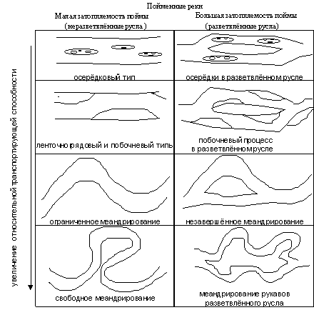 Вертикальная ось представляет собой ограничивающее условие, и именно – отношение ширины поймы к ширине русла. Действительно, в широком русле может быть и прямое, и извилистое, и многорукавное русло. На горизонтальной оси расположены извилистые, прямые неразветвлённые русла и русловая многорукавность. На рисунке 1 показано, что определяющим фактором для такого ряда типов является относительная транспортирующая способность потока.