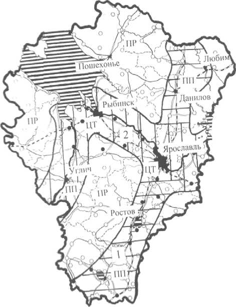 Рис. 1. Ареалы преимущественного социально-экономического развития Ярославской области (I − Транзитный меридиональный ареал. 2 − Волжский пространственный «коридор» (ареал): ЦТ − центральные территории: ПП − полупериферийные территории: ПР − периферийные территории).