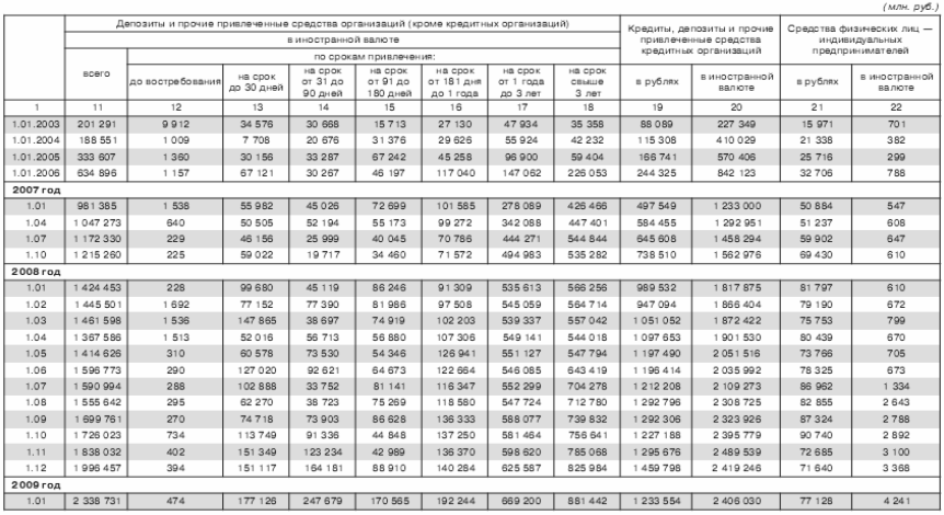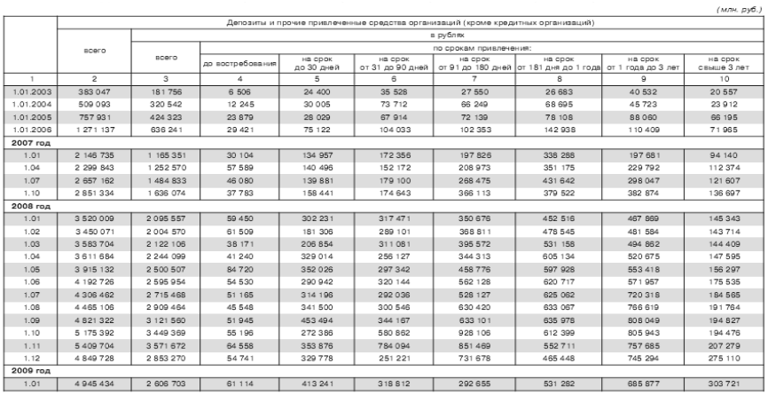 Данные об объемах привлеченных кредитными организациями средств организаций (в руб.)