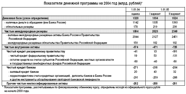 Банк России, исходя из предварительных расчетов состояния платежного баланса страны и проекта бюджета на 2004 год, считает возможным принять в качестве цели денежно-кредитной политики на 2004 год ограничение прироста потребительских цен в пределах 8_10% в расчете декабрь 2004 года к декабрю 2003 года.