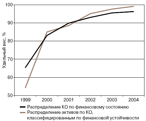 На начало 2004 года количество финансово стабильных кредитных организаций (к ним относятся банки без недостатков в деятельности — 1-я группа — и банки, имеющие отдельные недостатки, — 2-я группа), составляло 1279 (на 01.01.03 — 1269). Их доля в общем количестве действующих кредитных организаций составляла почти 95%, а в банковских активах — 96%. Средства предприятий и организаций, вклады физических лиц, бюджетные средства и меж банковские кредиты практически в полном объеме размещены в финансово стабильных банках. На банки 3-й и 4-й групп приходилось менее 1% объема указанных средств.