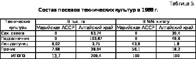 Продолжая рассматривать земледелие в данных регионах, обратим свои взгляды на таблицу 5, в которой отражены состав и структура посевов технических культур.