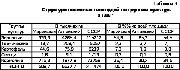 Как видно из таблицы, Марийская АССР имеет практически такую же структуру посевных площадей, как и в среднем по СССР. Отличие наблюдается лишь в том, что доля картофеля более чем вдвое выше среднего по Союзу уровня. Это произошло за счет площади посевов технических культур, доля которых значительно ниже. Это можно объяснить большим количеством потребителей картофеля – вблизи находятся несколько крупных городов (Н. Новгород, Чебоксары) и низкой пригодностью здешних земель для технических культур.