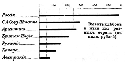 Сельское хозяйство. У нас в России важнейшим источником существования является земледелие. Из 176 миллионов населения от земли кормятся приблизительно 134 миллиона. Во всей России, считая Сибирь и Среднюю Азию, собирается до 3000 миллионов пудов хлеба (пшеницы и ржи), до 1600 миллионов пудов овса и ячменя, до 2600 мил. пудов разных других хлебов и картофеля. Из них внутри страны потребляется 4/5 и только 1/5 вывозится за границу и продается в другие страны. Продаваемый за границу хлеб, особенно пшеница (см. диаграмму), – главное богатство России, то, чем она преимущественно участвует в торговом обмене стран между собой и за что она получает от них деньги. Поэтому хороший или плохой урожай для России имеет огромное значение. В годы плохих урожаев части населения недостает хлеба, уменьшается вывоз хлеба за границу, а следовательно, и приток денег, что в свою очередь отражается на всей хозяйственной деятельности населения: уменьшается сбыт фабричных изделий, а часть фабрик даже закрывается, падает торговля. Но и годы хороших урожаев не всегда еще несут с собой благоденствие. Кроме России, вывозят и другие страны: Соединенные Штаты, Аргентина, Румыния, Канада, Австралия. И если урожай в России совпадает с урожаем и в этих странах, то вследствие избытка хлеба цена на него сильно падает и к нам поступает меньше денег. Кроме того, русский хлеб на иностранных рынках ценится дешевле вследствие того, что зерно плохо очищается и содержит много сорных примесей, а муки мы вывозим мало.