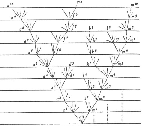 Классическая схема дивергенции по Дарвину имеет вид древа, ветви которого, раз разделившись, уже никогда более не сольются (рис. с сайта macroevolution.narod.ru)