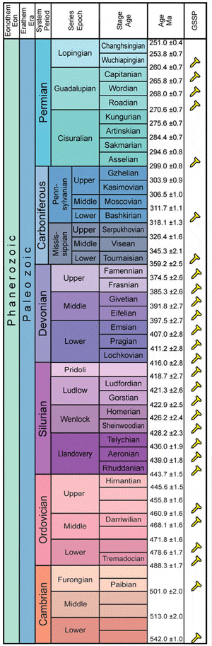 Глобальная геохронологическая шкала палеозойской эры. «Золотыми гвоздями» обозначены стратиграфические границы, для которых имеются официально признанные «типовые» геологические разрезы, на которых отмечена точка или пограничная линия между слоями, служащая глобальным эталоном данной границы (изображение с сайта stratigraphy.org)