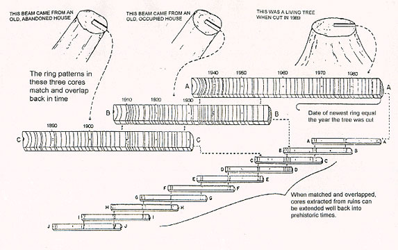 Дендрохронологический метод, или датирование по древесным кольцам, в большой чести у археологов. Этот метод позволяет датировать только самые молодые отложения (возрастом до 5-8 тысяч лет), зато с очень высокой точностью, вплоть до одного года! Нужно лишь, чтобы в раскопе обнаружилось достаточное количество древесины. В стволах большинства деревьев образуются годовые кольца, ширина которых колеблется в зависимости от погодных условий соответствующего года. Характерные «спектры» широких и узких колец примерно одинаковы у всех деревьев данной местности, растущих одновременно. Специалисты по дендрохронологии составляют сводные дендрохронологические шкалы, протягивающиеся от сегодняшнего дня в прошлое. Очень помогают в этом деревья-долгожители. Самому старому из доживших до наших дней деревьев было 4844 года, когда его срубили в 1965 году (это считается одним из самых печальных событий в истории дендрохронологии). Старейшему из живых деревьев на планете 4789 лет. Это сосна (Pinus longaeva), растущая в Калифорнии.