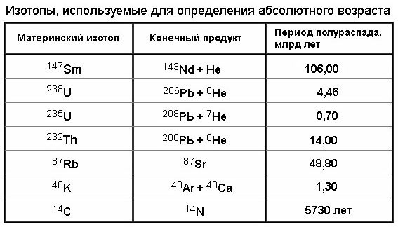 Из методов определения абсолютного возраста наиболее широко применяются так называемые радиометрические методы, основанные на постоянстве скорости распада радиоактивных изотопов (см. таблицу).