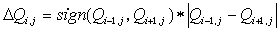 Sign(Q>i,j>,Q>i+1,j>) - это функция, определяющая знак изменения давления в узле i,j на текущем шаге в зависимости от направления и значения окружающих его расходов газа Q>i,j> и Q>i+1,j>. Алгоритм выбора отображен на рис.5.