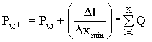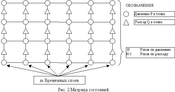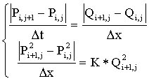 Исходя из постановки задачи имеется начальное состояние трубы в виде массивов P>i,0> и Q>i,0> (где i=1,.,n). Тогда совокупность всех временных слоев (т.е. состояний на текущий момент) описывается состоянием труб P>i,j >и Q>i,j> (где i=1,....,n и j=1,...,m).