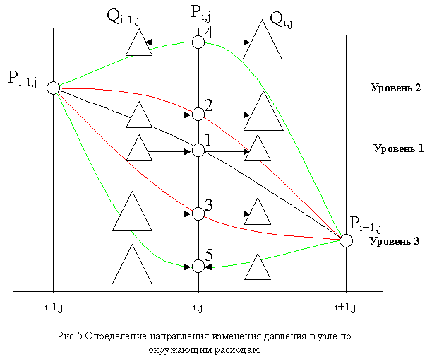 На рис.5 приведен пример, когда P>i-1,j>>P>i+1,j> (хотя для и P>i-1,j><P>i+1,j> правила описанные ниже сохраняются) причем P>i,j> может иметь 5 разных значений (1-5) относительно уровней 1-3. Уровень 1 представляет собой значение P>i,j> при стационарном течении газа между P>i-1,j> и P>i+1,j>, уровни 2,3 v это давления на концах трубы.