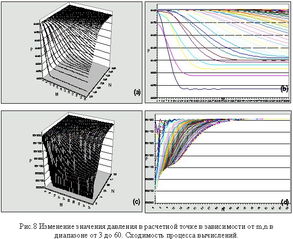 Увеличение числа n значительно сказывается на относительной погрешности только при m>13 (рис.8b). Однако рекомендуется использовать n>30, т.к. при этом давление в точке равномерно без скачков стремится к своему предельному значению (рис.8d). Природа колебания значения давления около определенной кривой объясняется апроксимацией значения давления разностной схемой решения на грубых сетках. Поэтому лучше использовать n>30, но при этом значительно увеличивать n не имеет смысла., так как увеличится время расчетов.