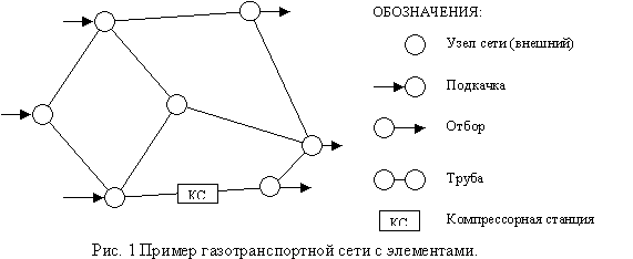 Определим задачу, которую должна описывать и решать модель ГТС. Пусть заданы начальное распределение давления P>i,0> по всей ГТС (где i=1,..,n v пространственный слой) и граничные условия на подаче и отборе газа в систему по времени. Необходимо определить распределение давления P>i,j> и расхода Q>i,j >по ГТС для каждого временного слоя j, где j=1,...,m. Пример ГТС с элементами приведен на рис.1