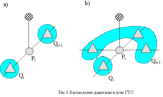Как видно из рис.6,а) для определения давления следующего временного слоя трубы используется два соседних расхода газа около этого узла. Если исходить из этого, то для узла ГТС нужно выбрать какое-то ребро с расходом Q>i>, а все остальные расходы сложить с учетом знака в Q>i+1>. Тогда давление в узле ГТС можно считать по тем же правилам (3), что и для узла трубы. Тем самым мы обобщаем правило расчета давления для любого узла системы: