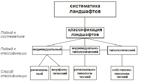 Таким образом, систематика ландшафтов – это родовое понятие по отношению к классификации ландшафтов. Последняя представляет собой подход к систематике. В свою очередь подход к классификации может быть индивидуальным, индивидуально-типологическим и типологическим. Каждому из них присущи свои способы классификации (рис.).
