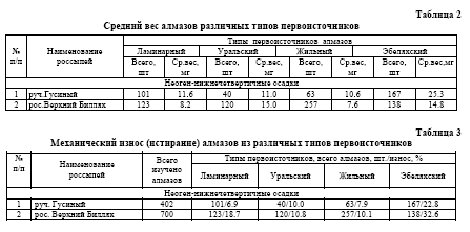 Типоморфизм алмазов разных первоисточников изучен по двум участкам - Верхний Биллях и Гусиный [2]. На участке “Верхний Биллях” наряду с общей закономерностью пониженного среднего веса наблюдается снижение весов алмазов по ламинарному, “жильному” и “эбеляхскому” типам. Средний вес алмазов уральского типа несколько выше (табл.2).