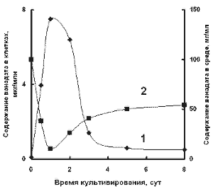 Действительно, как показывают наши опыты содержание ванадата в клетках Ps. diminuta, в течение первых 2 суток культивирования быстро увеличивается от 0 до 5-6 мкг/млн клеток, а затем снижается приблизительно в 10 раз (рис. 2, кривая 1). Иная картина наблюдается относительно концентрации ванадата в культуральной жидкости. За первые двое суток культивирования Ps. diminuta содержание ванадата в среде падает от 100 до 10-12 мг/л, а затем начинает постепенно увеличиваться по мере развития культуры; причем в среду возвращается до 60% ванадата (рис. 2, кривая 2). Как видно, накопление ионов ванадия в клетках коррелирует c его содержанием в культуральной жидкости: увеличение концентрации ванадата в клетках сопровождается ее снижением в среде культивирования и наоборот.