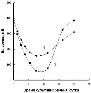 Рис. 4. Изменения величины E>h> среды в динамике развития культуры Ps. diminuta. 1 - контроль; 2 - в присутствии 100 мг/л ванадата.