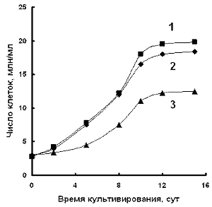 Рис. 1. Эффект ванадата на рост культуры Ps. diminuta; 1 - контроль; 2, 3 - в присутствии 100 и 700 мг/л ванадата соответственно.
