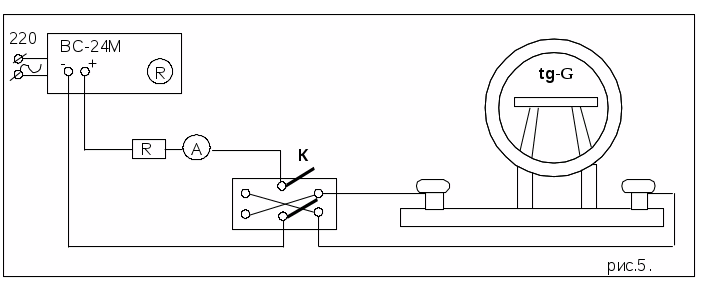 Регулятор напряжения R на панели выпрямителя вывести в крайнее левое положение. Включить выпрямитель и поставить переключатель К в левое или правое положение. Регулятором напряжения R установить ток в цепи I=0,5A. зафиксировать угол отклонения магнитной стрелки. Перекинуть ключ К в противоположное положение и также зафиксировать угол отклонения стрелки. Это необходимо для плоскости нахождения среднеарифметического значения угла отклонения магнитной стрелки, т.к. всегда имеется неточность в установлении витков tg в плоскости магнитного меридиана.