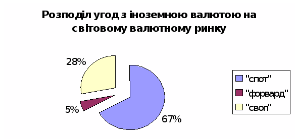 Приблизний розподіл угод з іноземною валютою на світових валютних ринках такий: "спот" — 67%, "форвард" — 5%, "своп"—28%.(рис. 1.1.)