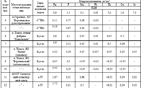 Для подземных вод, используемых для питьевого водоснабжения населения обязательна характеристика микроэлементов, ограниченных ГОСТом 2874-82 "Вода питьевая". В число гостированных микроэлементов входят Fe, F, Mn, Pb, Cu, Zn, Mo, Sr, As, Be, Se. На рассматриваемой территории из перечисленных микроэлементов в грунтовых водах обнаружены Fe, F, Zn, Pb, Mn, Cu, Sr. Широким распространением пользуются Fe, F и Mn, и менее распространены Zn, Pb, Cu и Sr. Концентрация микроэлементов современно-четвертичного, верхнечетвертичного и апт-неокомского водоносных горизонтов представлены в таблице 2.