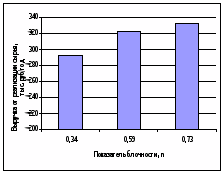 Рис. 3. Выручки от реализации сырья в зависимости от показателя блочности (а – интенсивность трещиноватости 0,77 м2/м3,