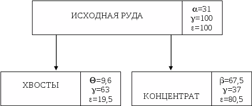 Определить основные технологические показатели обогащения железной руды, содержащей 31% железа (=31%), при котором получен концентрат с содержанием железа 67,5% (=67,5%) и хвосты с содержанием железа 9,6% (=9,6%).