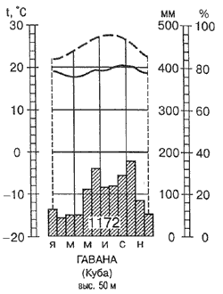 Рис. 3. Годовой ход температур, осадков и относительной влажности на Кубе