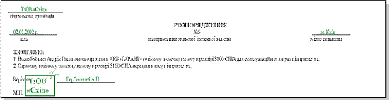 2.Копия поручения (распоряжения) (если поручение было дано в письменной форме) руководителя на получение денежных средств в инвалюте на командировку или на эксплуатационные затраты в кассе обслуживающего предприятие банка. Этот документ, если он составляется письменно, имеет произвольную форму (см. рис.).