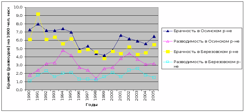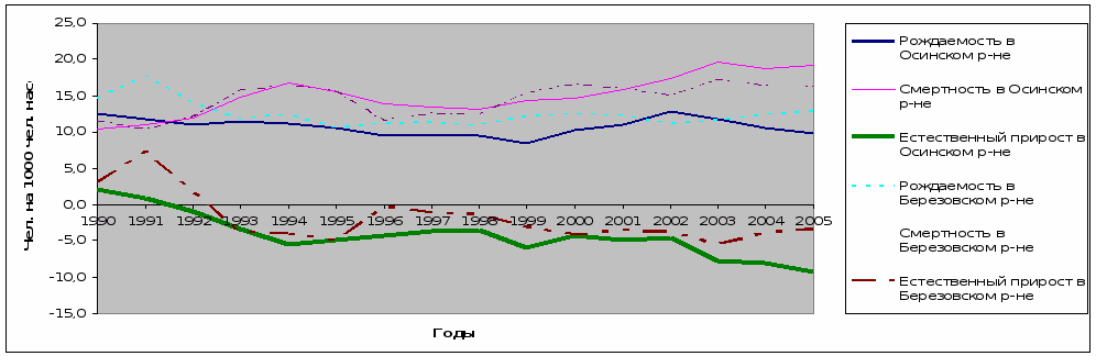 Рождаемость В Березовском районе была несколько выше, чеми в Осинском, в 1991г. даже на 6 pm. В 2002-2003 гг. рождаемость в Осинском районе возросла, в Березовском продолжала снижаться, и оказалась на 1-2 pm ниже. Различия в смертности были незначительны, лишь в последние годы смертность в Осинском районе устойчиво была более высокой. Естественная убыль в Осинском районе началась на год раньше, и была заметно глубже, особенно большие арзличия на 5-6pm характерны для 2004-2005гг. Примечательно, что в годы максимального экономического кризиса естественная убыль в Березовском районе была незначительна.