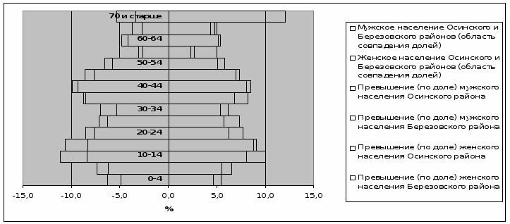 Сравнение половозрастных пирамид. Доля женщин детородного возраста по сумме возрастов 20-40 лет в Осинском районе несколько выше. Рождаемость, напротив, выше в Березовском районе. вероятно, здесь как и в большинстве типично сельских районов выше интенсивность рождений, (сохраняется ориентация на более многодетную семью, позже завершился демографический переход, о чем свидетельствует высокая рождаемость в 1991г). Национальный фактор не должен был повлиять на рождаемость – в обоих районах преобладает русское население. В Бернзовском районе также несколько больше разность брачности и разводимости.