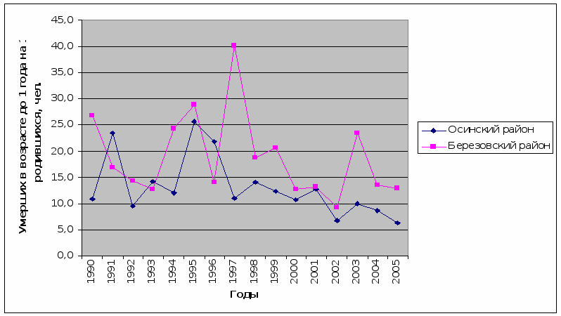 Младенческая смертность в Березовксом районе практически все годы намного выше, чем в Осинском, что вполне объяснимо низким уровнем развития медицинского обслуживания в аграрном Березовском районе. В Осинскои районе менее заметны резкие колебания младенческой смертности, в связи с большей численностью населения. В последние годы уровень младенческой смертности здесь снизился до вполне приемлемых показателей.