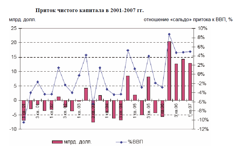 Подобные двигатели всплеска инвестиционной активности, основанные прежде всего на конъюнктурных обстоятельствах, по своей природе не могут быть стабильными. Приток капитала, принявший характер самоподдерживающегося процесса (чем больше приток, тем сильнее укрепляется рубль и, соответственно, тем обильнее притекает капитал), как и всякий подобный процесс в экономике, теоретически представляется легко обратимым.