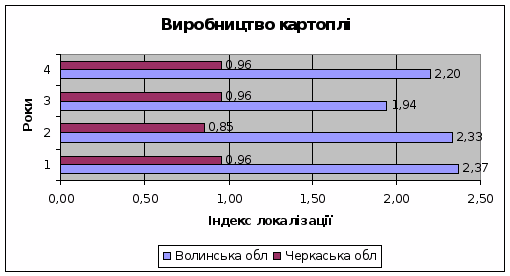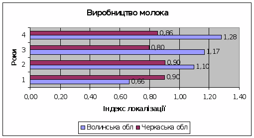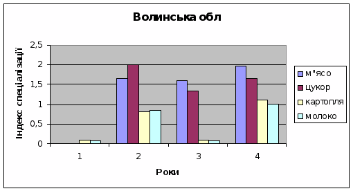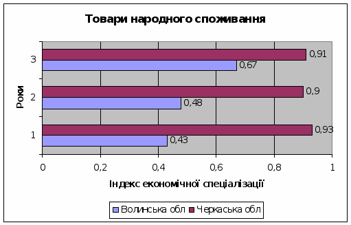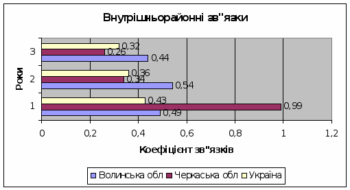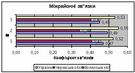 Коефіцієнт внутрішньорайонних зв’язків показує, що виготовлена продукція більше споживається у Волинській обл, ніж у Черкаській обл., а міжрайонних зв’язків – що Волинська обл. більше експортує в інші області виготовленої продукції, ніж Черкаська обл. За коефіцієнтом міжрайонної товарності можна визначити переважання імпорту над експортом у Волинській обл., як у державі вцілому.